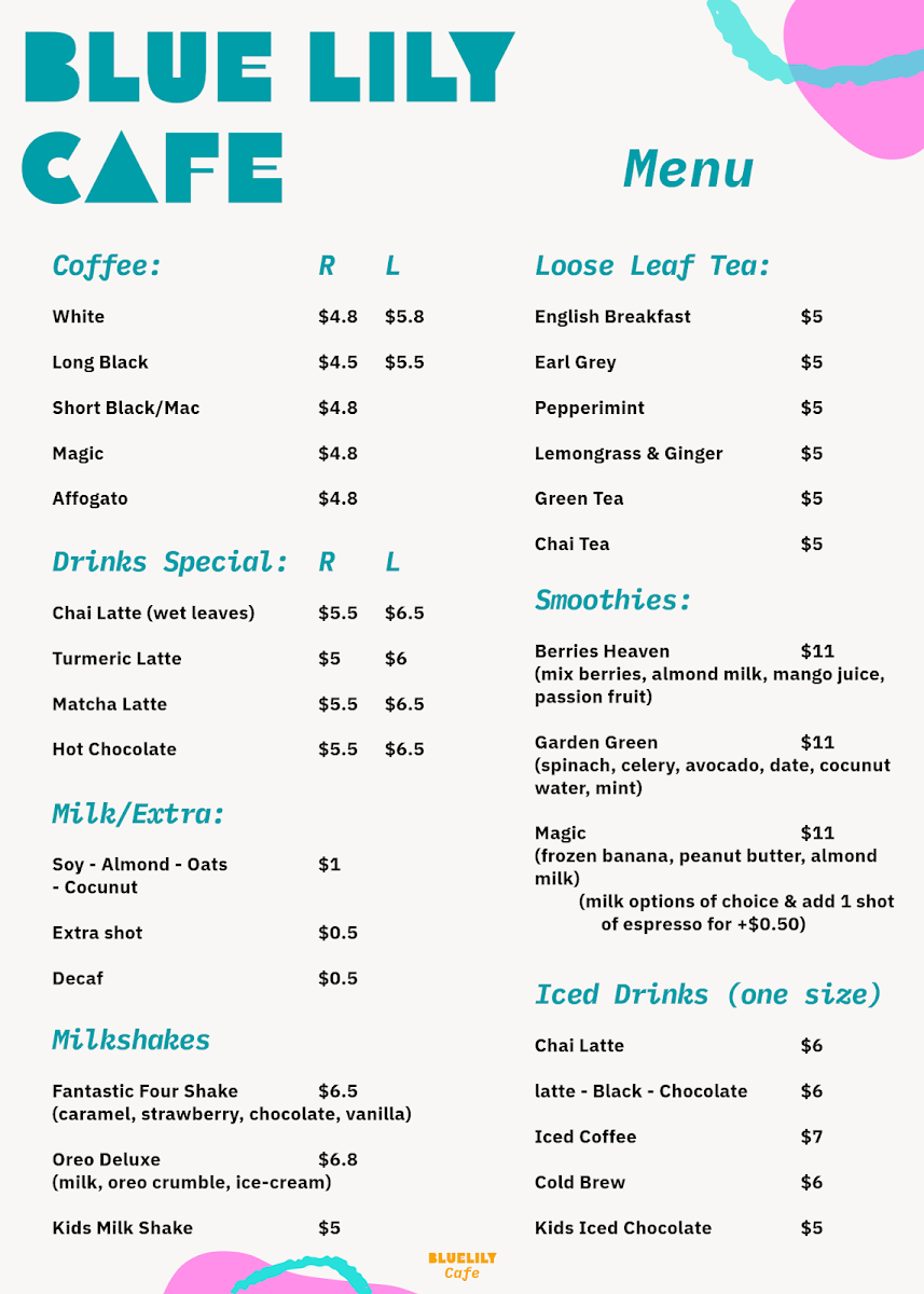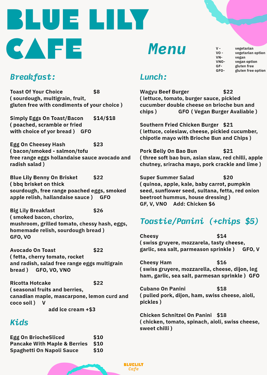 The Breakfast section features classic and contemporary choices such as eggs on toast, chilli scrambled eggs served on a croissant, salmon eggs benedict, and larger options like the Big Lily Breakfast. There are also lighter options including avocado on toast and ricotta hotcakes.