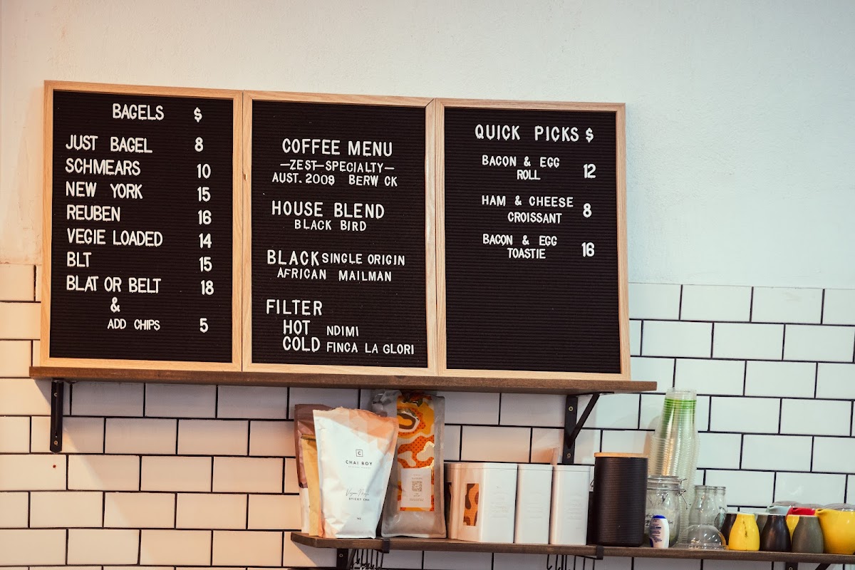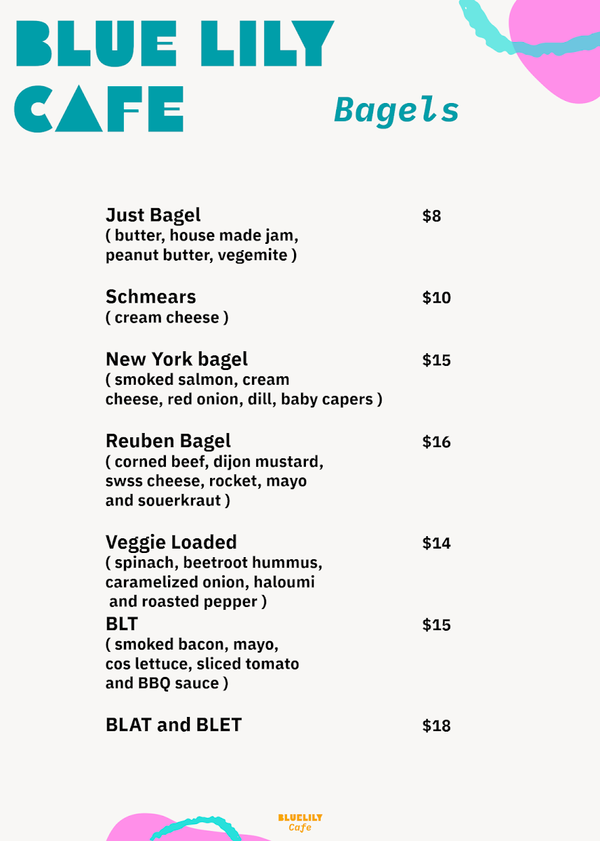 The menu is structured to offer a variety of options suitable for breakfast, casual dining, and coffee breaks. It includes distinct sections for breakfast dishes, bagels, and specialty drinks.